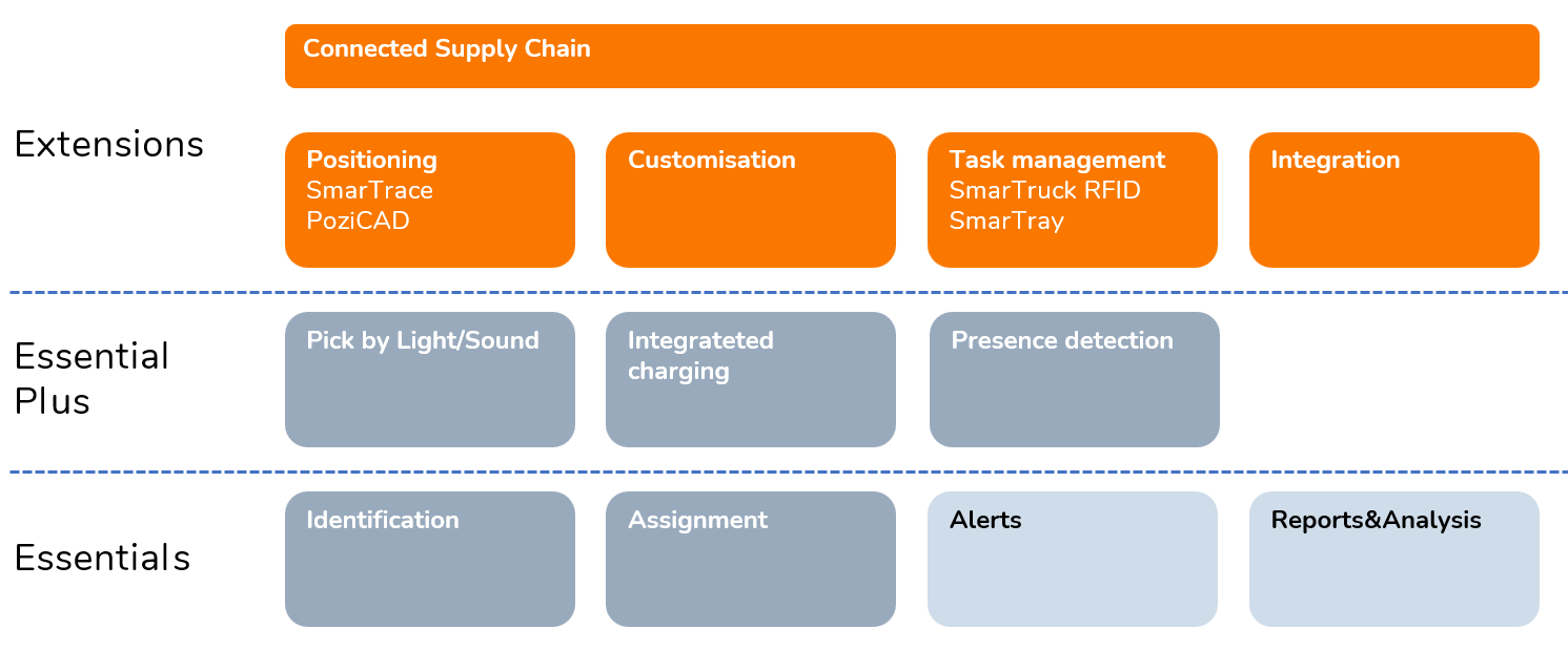 - A solution can be applied along entire supply chains, if the system is applied at all levels of the supply chain. With the help of the Connected Supply Chain structure, supply chain management can be built on real-time data in the entire supply chain.
