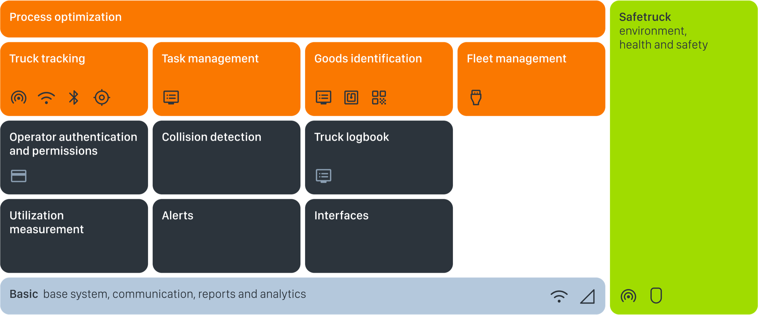 • Continuous, automatic tracking of trucks’ physical position with presence detection or coordinate positioning, both outdoors and indoors